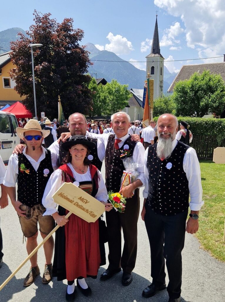 Unter dem Motto „Daham“ organisierte der MGV Dellach das 82. Gausingen in Dellach am 15. Juni 2025. Mit einem ökumenischen Gottesdienst und ca. 25 Chören und Kleingruppen wurde der Festakt am Dorfplatz eröffnet. Am Nachmittag gab es einen Umzug durch den Ort, wobei 10 Trachtenträger unserer Ortsgruppe die Chöre begleiten durften. Danach klang der Tag mit dem traditionellen „Platzlsingen“ gemütlich aus.